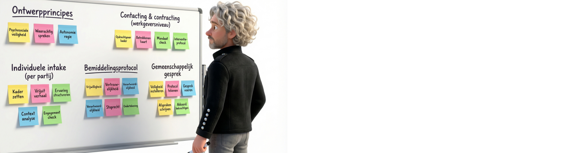 Conflictresolutie is geen wonderbaarlijk proces, maar een resultaat van gedeelde verantwoordelijkheid. De facilitator is meerzijdig partijdig én gebonden door het interventieprotocol en wettelijke kaders. Het derde principe stelt dat elke partij maximaal regie moet kunnen nemen over het eigen aandeel in het proces.